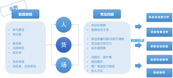 活动数据体系的设计可以参考零售经典“人-货-场”运营模型(图5)来实现数据驱动的精细化运营。“人”——洞悉相关客群(参与 vs. 未参与,App渠道 vs. 短信渠道等)的分布结构、画像分析、风险分析等。“货”——金融类或泛生活类产品和服务等活动权益的选品、备货、上架、成交和售后等。如金融产品购买率或权益使用率较低,需要分析推荐产品或权益是否匹配目标客群,是否门槛过高或缺少吸引力。“场”——活动场域的“氛围感”,包含客户参与的流转动线设计、活动页面排版布局和视觉风格等,客户参与活动体验的流畅性也是活动非常重要的一环。